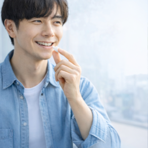指でつまみ、上唇の裏(歯ぐきと頬の間)に“ポンッ”と挟みます。